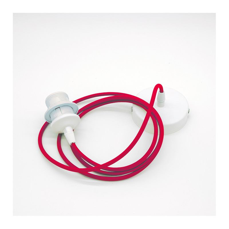 Electric suspension wire for ceiling lampshades. Maximum length 2 meters adjustable as needed. Red color. Standard E27 bulb socket. Base and ceiling support in white metal