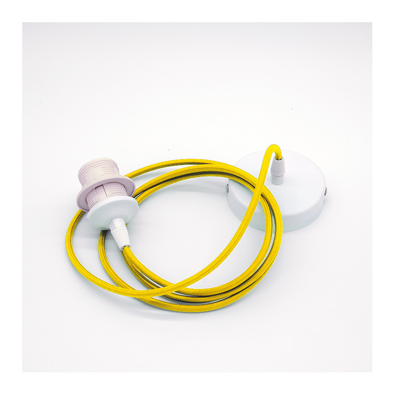 Electric suspension wire for ceiling lampshades. Maximum length 2 meters adjustable as needed. Yellow color. Standard E27 bulb socket. Base and ceiling support in white metal