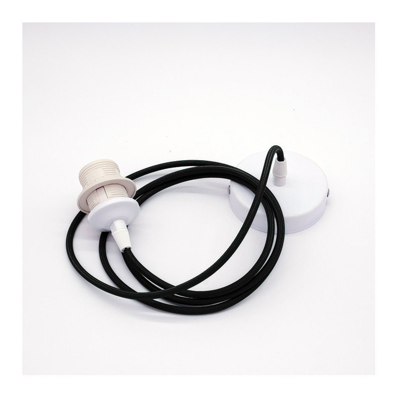 Electric suspension wire for ceiling lampshades. Maximum length 2 meters adjustable as needed. Black color. Standard E27 bulb socket. Base and ceiling support in white metal