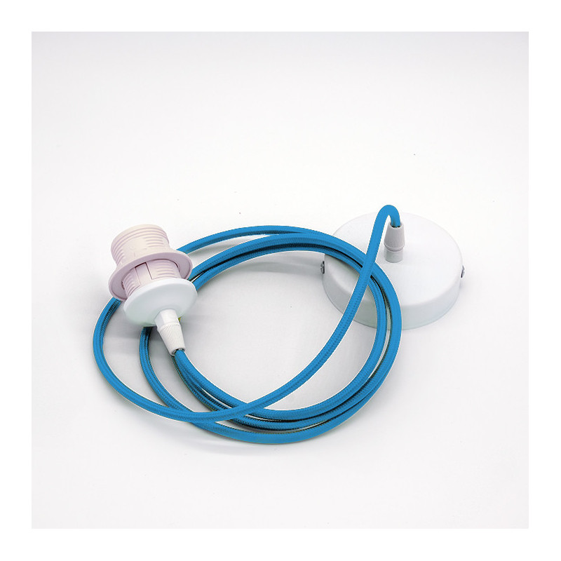 Electric suspension wire for ceiling lampshades. Maximum length 2 meters adjustable as needed. SKY BLUE color. Standard E27 bulb socket. Base and ceiling support in white metal