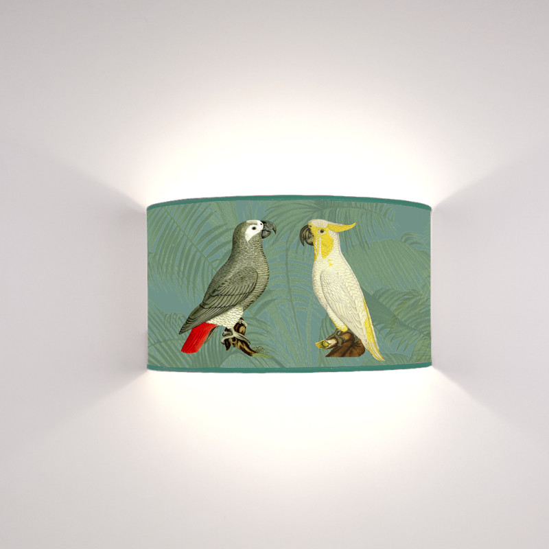 Ventola in tessuto stampato modello Fauna Cacatua fondo Verde disponibile nel diametro da cm. 25 o cm 35. Altezza cm 20 con attacco luce standard E27 (su richiesta è possibile ottenere eventuale riduzione ad attacco E14).