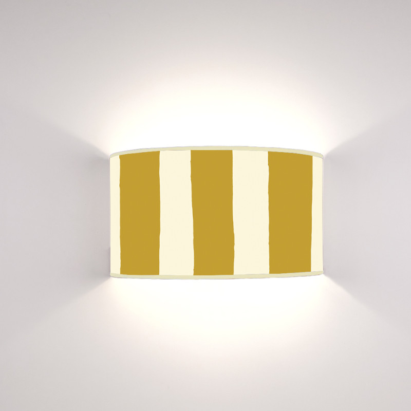 Ventola in tessuto stampato modello Geo Righe Senape su fondo Crema disponibile nel diametro da cm. 25 o cm 35. Altezza cm 20 con attacco luce standard E27 (su richiesta è possibile ottenere eventuale riduzione ad attacco E14).