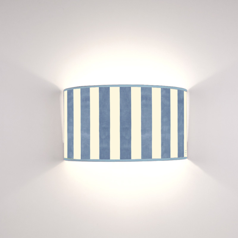 Ventola in tessuto stampato modello Righe Strette AVIO disponibile nel diametro da cm. 25 o cm 35. Altezza cm 20 con attacco luce standard E27 (su richiesta è possibile ottenere eventuale riduzione ad attacco E14).