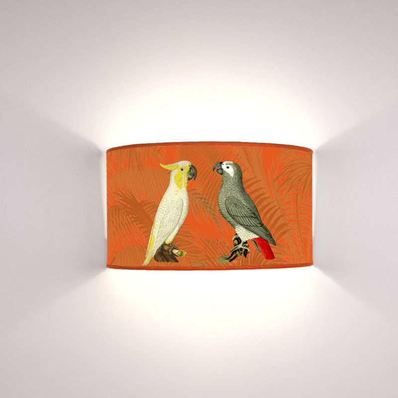 Ventola in tessuto stampato modello Fauna Pappagalli fondo Arancio disponibile nel diametro da cm. 25 o cm 35. Altezza cm 20 con attacco luce standard E27 (su richiesta è possibile ottenere eventuale riduzione ad attacco E14).