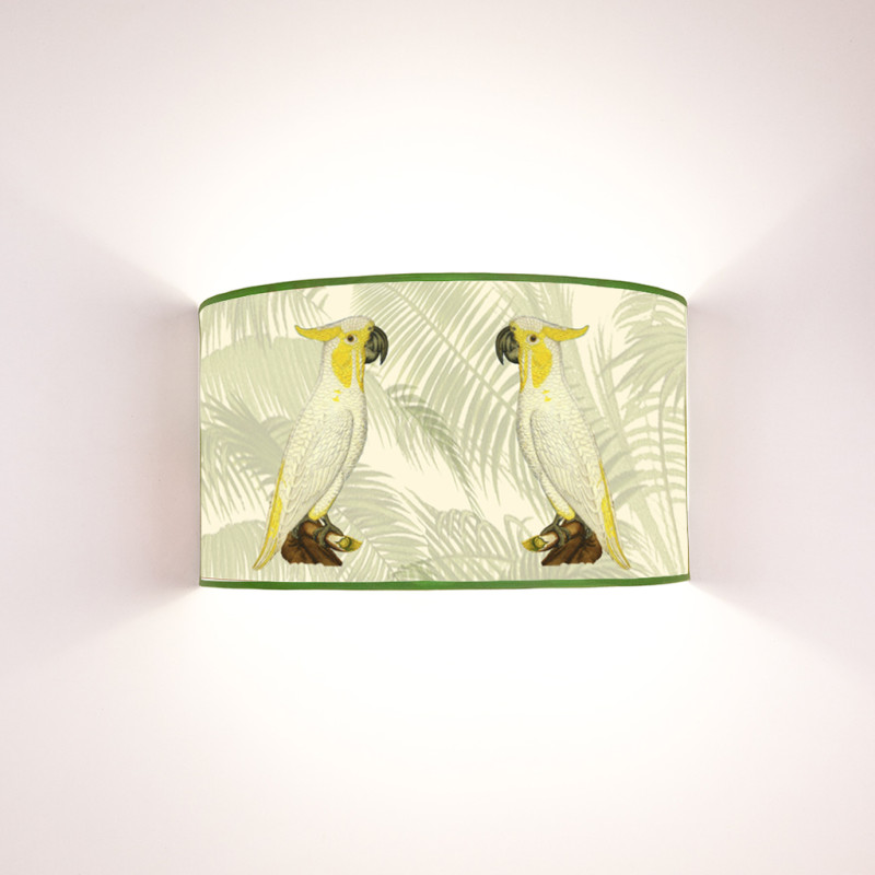 Ventola in tessuto stampato modello Cacatua fondo crema disponibile nel diametro da cm. 25 o cm 35. Altezza cm 20 con attacco luce standard E27 (su richiesta è possibile ottenere eventuale riduzione ad attacco E14).