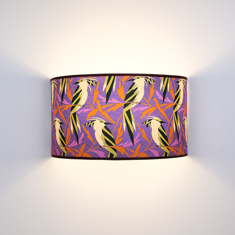 Ventola in tessuto stampato modello Varie Decò Uccelli. Altezza cm 20 con attacco luce standard E27 (su richiesta è possibile ottenere eventuale riduzione ad attacco E14).