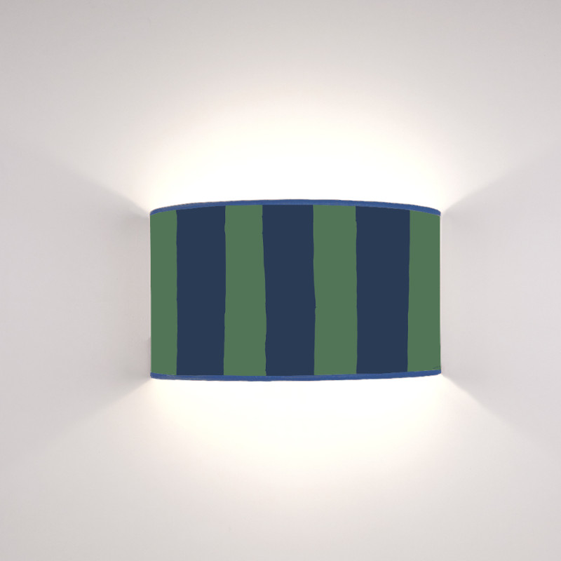 Ventola in tessuto stampato modello Geo Righe Blu su fondo Verde disponibile nel diametro da cm. 25 o cm 35. Altezza cm 20 con attacco luce standard E27 (su richiesta è possibile ottenere eventuale riduzione ad attacco E14).