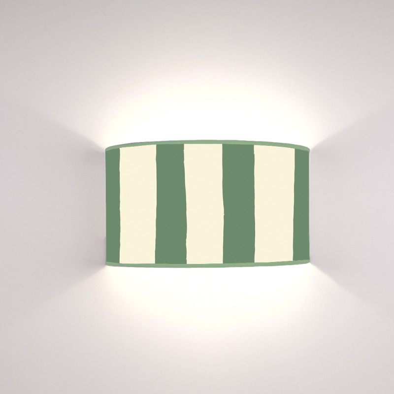 Ventola in tessuto stampato modello Geo Righe Verdi e Crema disponibile nel diametro da cm. 25 o cm 35. Altezza cm 20 con attacco luce standard E27 (su richiesta è possibile ottenere eventuale riduzione ad attacco E14).