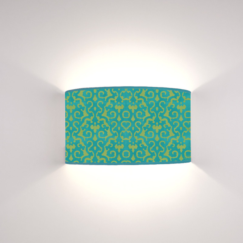 Ventola in tessuto stampato modello Arabesco Peacock su fondo Senape disponibile nel diametro da cm. 25 o cm 35. Altezza cm 20 con attacco luce standard E27 (su richiesta è possibile ottenere eventuale riduzione ad attacco E14).
