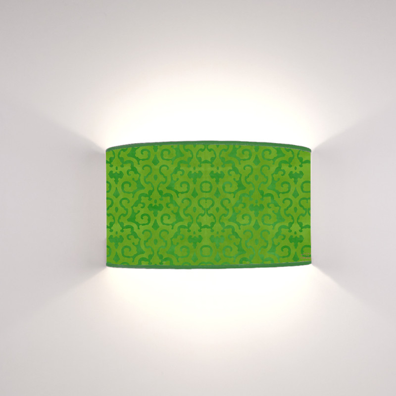 Ventola in tessuto stampato modello Arabesco Verde Mela su fondo Smeraldo disponibile nel diametro da cm. 25 o cm 35. Altezza cm 20 con attacco luce standard E27 (su richiesta è possibile ottenere eventuale riduzione ad attacco E14).