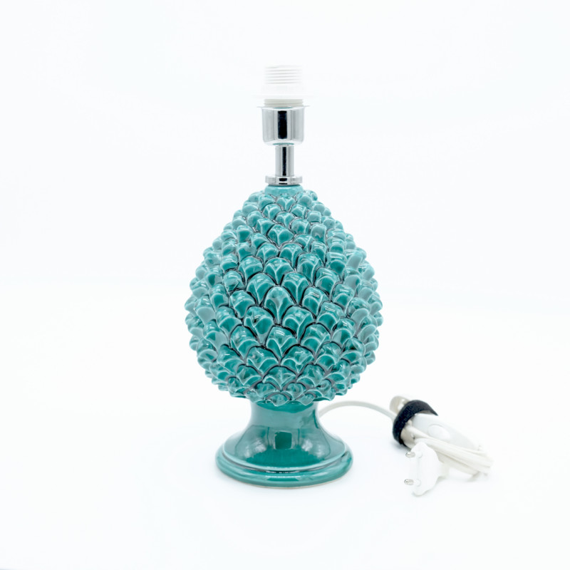 Direttamente dalla scuola dei ceramisti di Caltagirone la Base lampada Pigna Verde Smeraldo. Realizzata interamente a mano in ceramica. Completa di impianto elettrico e predisposizione con attacco standard europeo (E27).