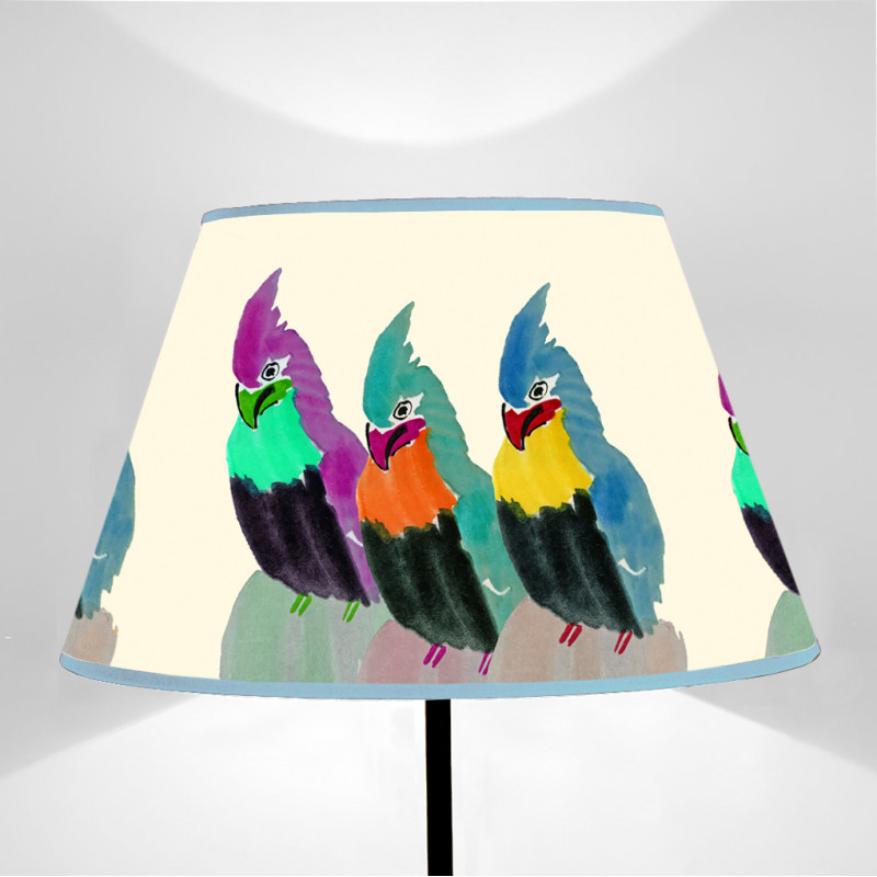 Paralume tronco di cono stampato su tela disegno Fauna Tre Pappagalli fondo Chiaro