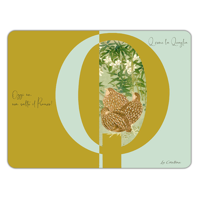 Sottopiatto rettangolare in fibra di legno e retro in sughero naturale disponibile nei due formati: classico 29 X 39 cm. e Breakfast 19 X 25 cm. Disegno Alphabet Lettera Q
