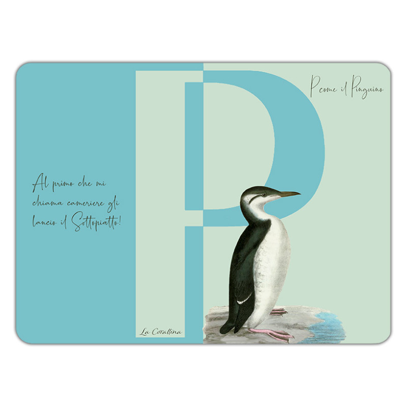 Sottopiatto rettangolare in fibra di legno e retro in sughero naturale disponibile nei due formati: classico 29 X 39 cm. e Breakfast 19 X 25 cm. Disegno Alphabet Lettera P